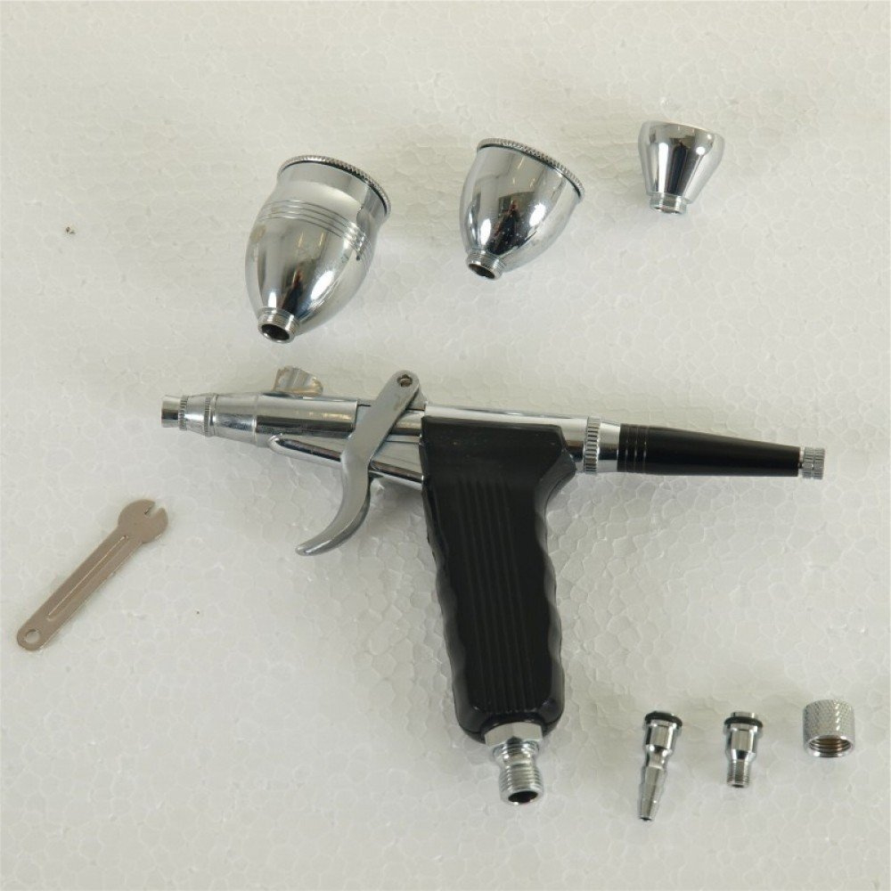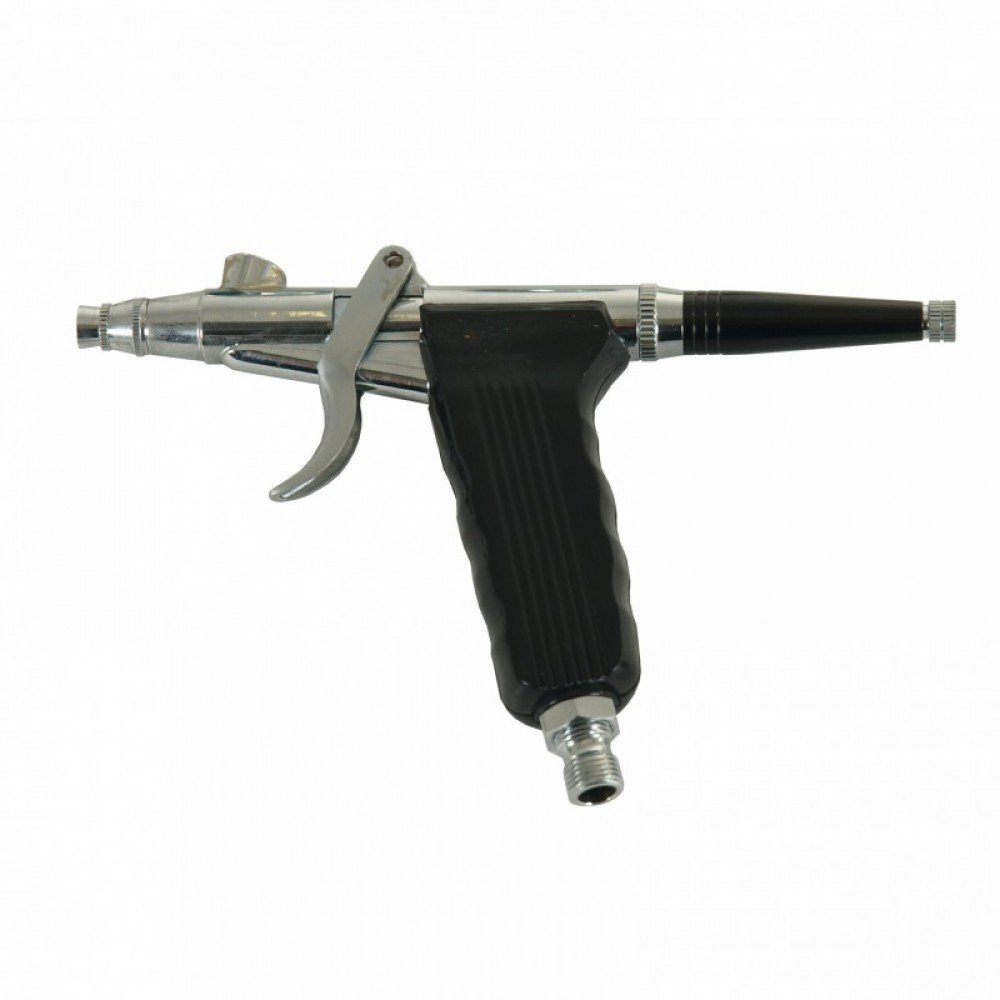 Dwufunkcyjny aerograf o ergonomicznym kształcie pistoletu lakierniczego umożliwia wygodne malowanie a wymienne dysze o różnych średnicach pozwalają na dostosowanie odpowiedniego rozmiaru do żądanej grubości kreski. Dodatkowo wbudowany ogranicznik posuwu iglicy pozwala na kontrolę ilości wydostającej się farby, dzięki czemu nawet początkujący jest w stanie kontrolować precyzję jej nanoszenia. Dzięki wymiennym zbiorniczkom na farbę o różnej pojemności, użytkownik może dostosować ich rozmiar w zależności od spodziewanego zużycia farby, co umożliwia jej oszczędność. Idealny zarówno dla początkujących jak i zaawansowanych użytkowników. Dzięki zestawowi końcówek (gwint 1/8 cala, 5 mm, choinka 4 mm) przystosowany do podłączenia do niemal każdego źródła powietrza.