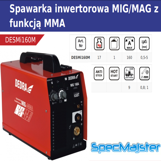 Spawarka inwertorowa MIG/MAG z funkcją MMA firmy Dedra jest przenośną spawarką nowej generacji  przeznaczoną do spawania łukowego metodą MIG/MAG w osłonie gazowej oraz dodatkowo metodą MMA elektrodą otuloną.
