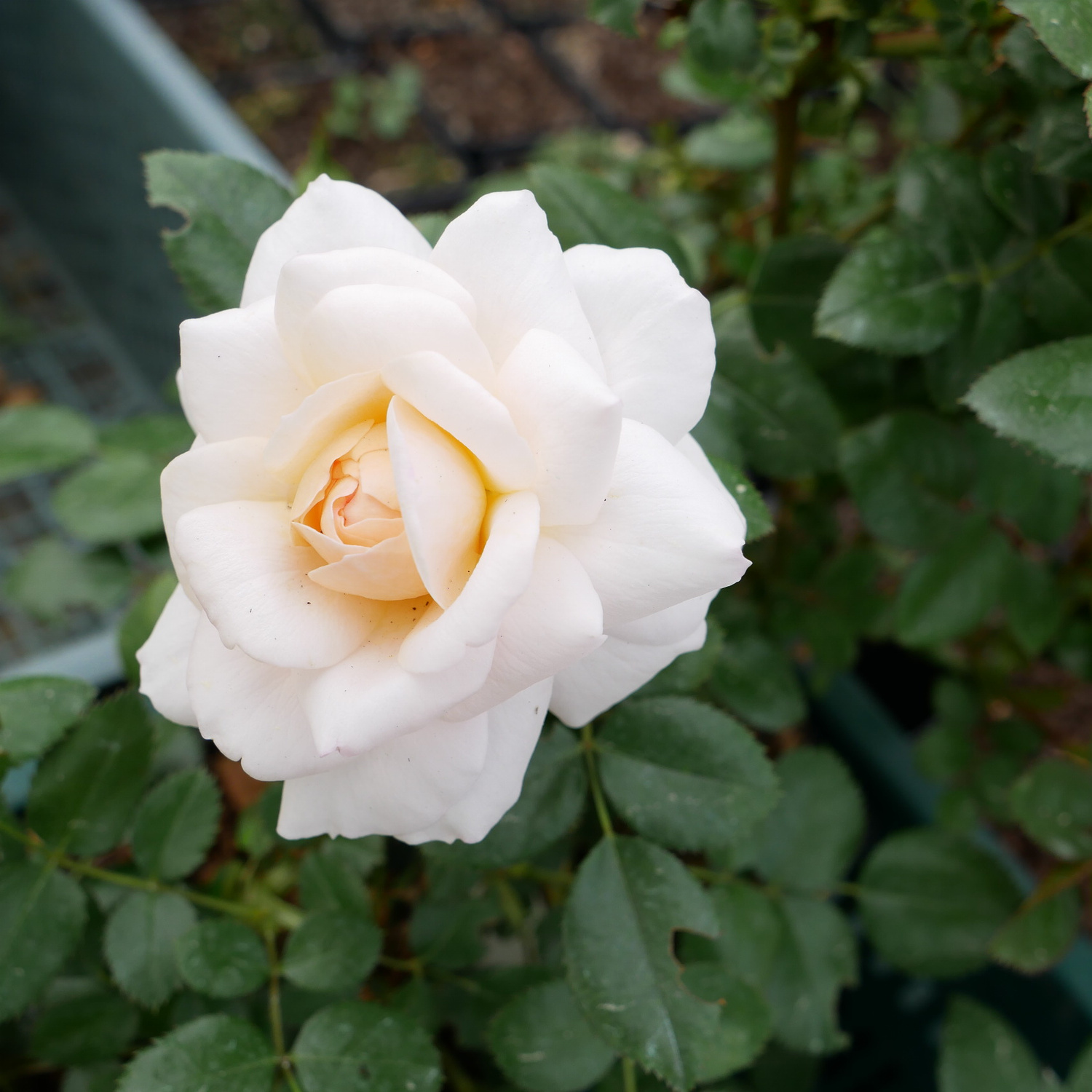 - Kwiaty: pełne, kremowo-morelowe, równo ułożone; ok. 8 cm średnicy