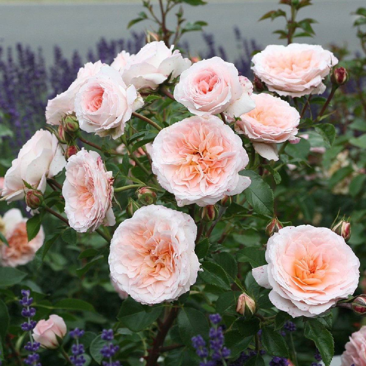 Krzew dorasta do około 120–140 cm wysokości i 60–90 cm szerokości, tworząc wyprostowaną, dobrze rozkrzewioną formę. Kwiaty o średnicy około 8 cm pojawiają się w dużej liczbie – często po kilkanaście na jednym pędzie – a ich ciężar sprawia, że pędy układają się z gracją i lekko opadają. Delikatny, przyjemny zapach dodaje odmianie uroku, nie przytłaczając kompozycji. Liście są zdrowe, ciemnozielone i lekko błyszczące, co podkreśla jasną barwę kwiatów.