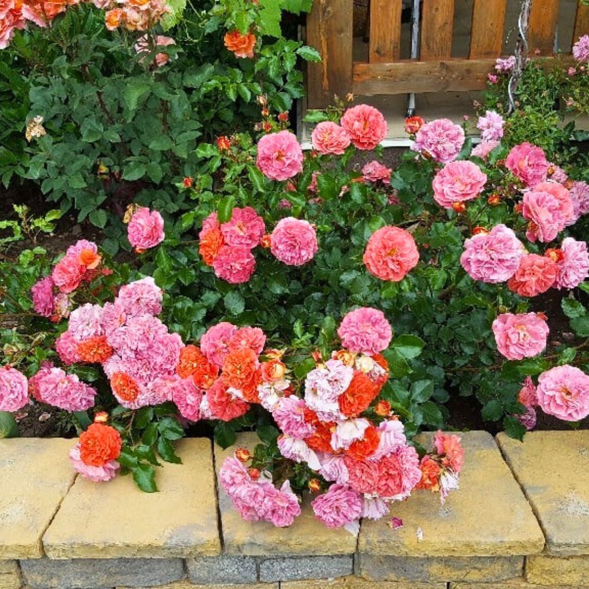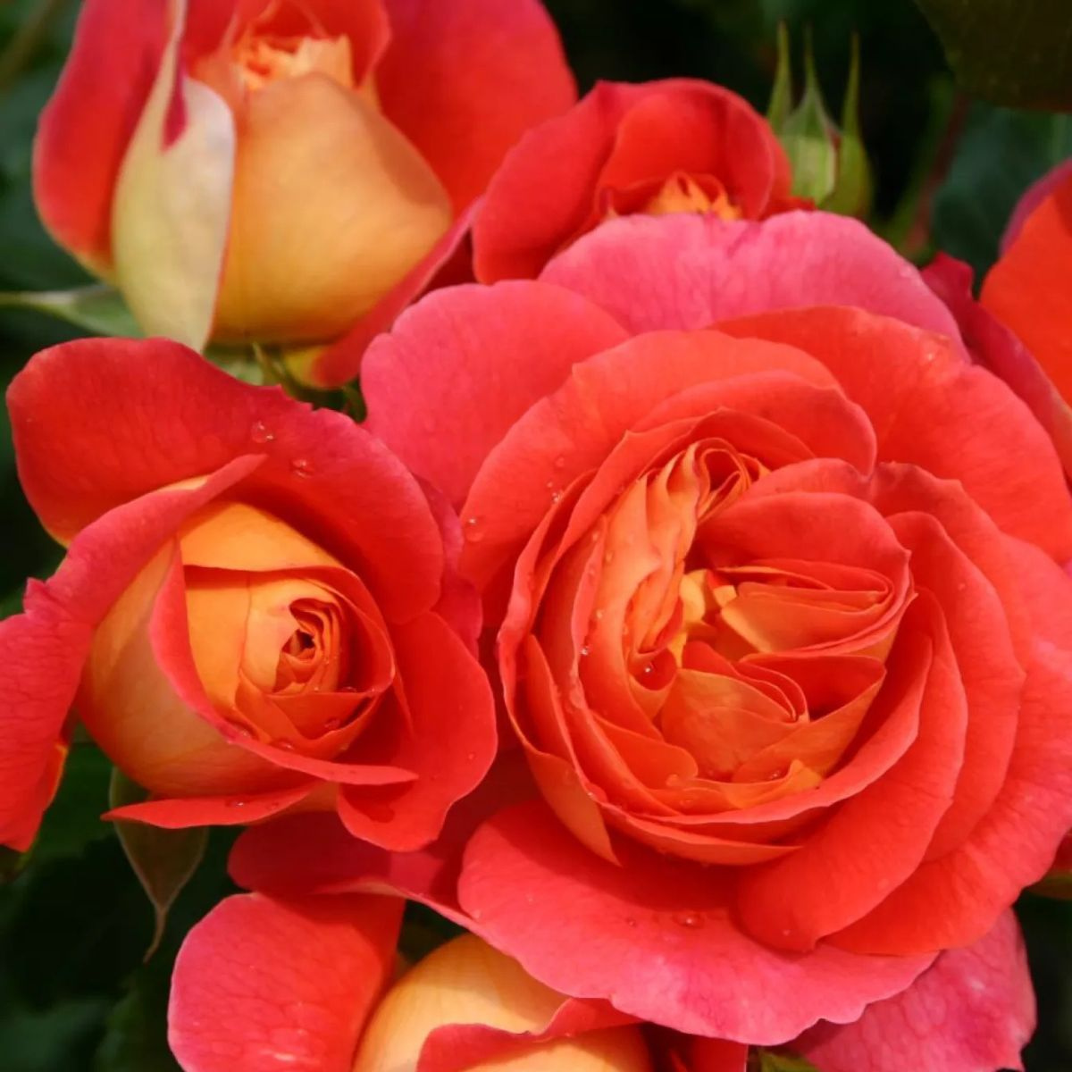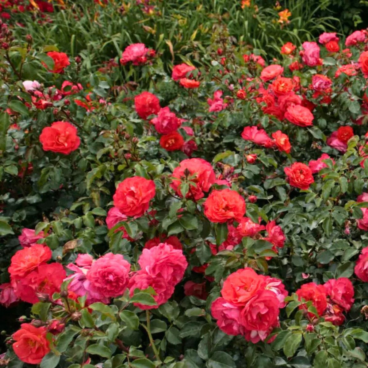• Rose Gebruder Grimm|Róża rabatowa Gebruder Grimm dorasta do 70cm wysokości i 50m szerokości. Kwiaty ma pełne, dwukolorowe, pomarańczowo-czerwone i średnicy 6-7cm. Róża ta silnie się krzewi, o pionowym pokroju, powtarza kwitnienie.