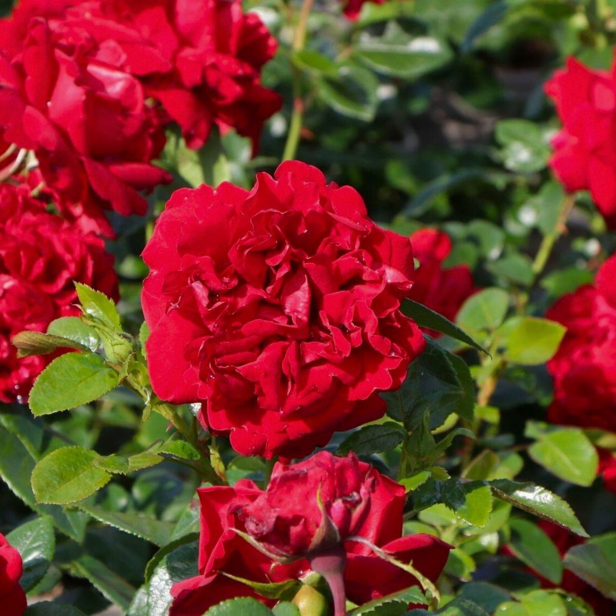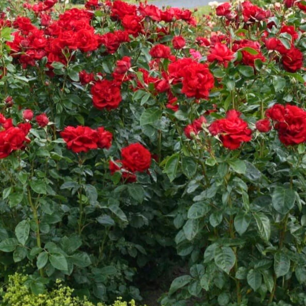 - Rose Jugendliebe |Róża rabatowa Jugendliebe dorasta do 80cm wysokości i 40m szerokości. Kwiaty ma pełne, o barwie intensywnej czerwieni i średnicy 10m. Róża ta silnie się krzewi, o pionowym pokroju, powtarza kwitnienie.