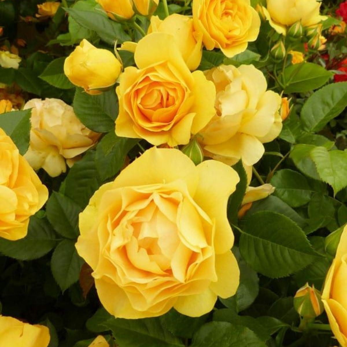 - Rosa Allgold| Pokrój krzaczasty, mocne, wzniesione pędy. Róża wielokwiatowa ma piękne i duże kwiaty osadzone pojedynczo lub w małych gronach na luźno rozmieszczonych długich łodygach. Krzewy powtarzają kwitnienie.