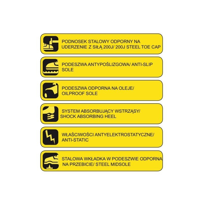 Buty bezpieczne z systemem absorbującym wstrząsy oraz właściwościami elektrostatycznymi. Podnosek wykonany ze stali odporny na uderzenia. Antypoślizgowe podeszwy ANTI-SLIP SOLE oraz odporne na olej. Stalowa wkładka w podeszwie odporna na przebicie.
