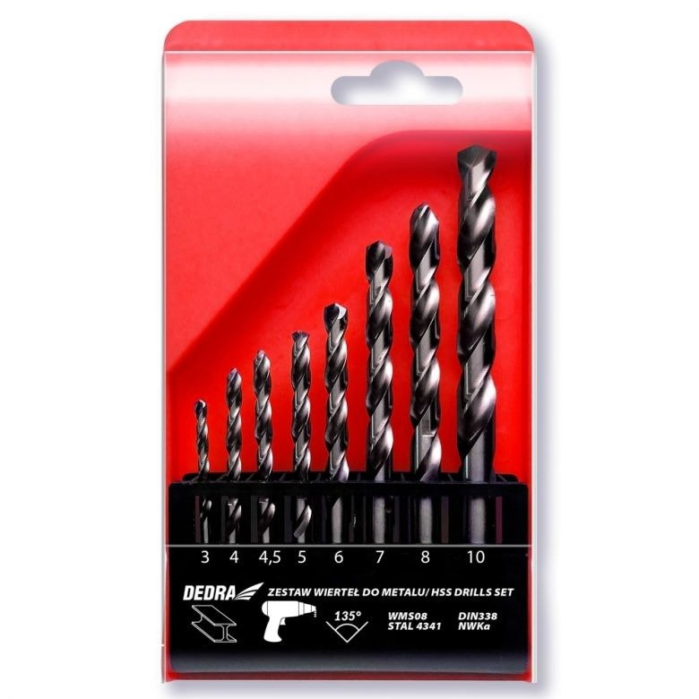 Zestaw 8 wierteł do metalu wykonanych z wysokogatunkowego stopu stali. Wymiary wierteł to: 3x61mm; 4x75mm; 4,5x80mm; 5x86mm; 6x93mm; 7x109mm; 8x117; 10x133mm.